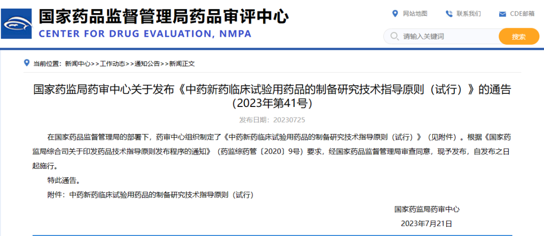 國(guó)家藥監(jiān)局藥審中心關(guān)于發(fā)布《中藥新藥臨床試驗(yàn)用藥品的制備研究技術(shù)指導(dǎo)原則(試行)》的通告(2023年第41號(hào))
