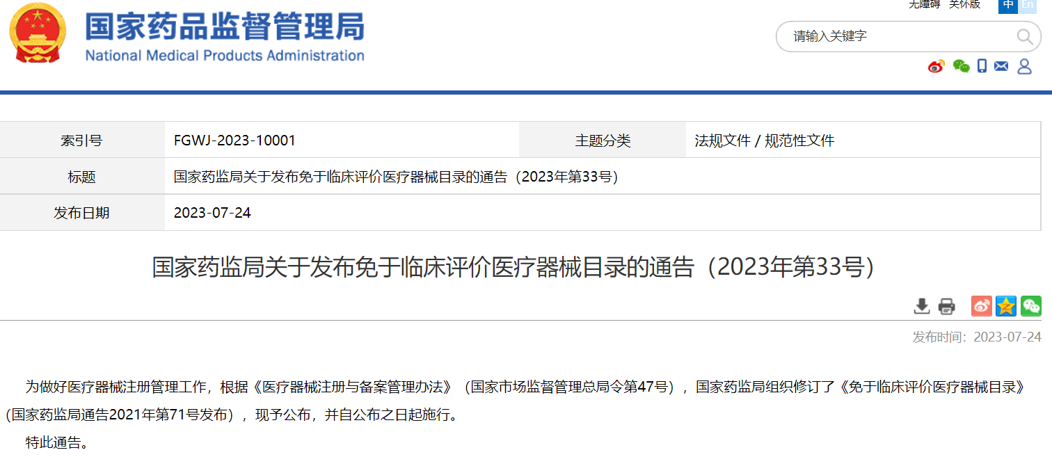 國(guó)家藥監(jiān)局關(guān)于發(fā)布免于臨床評(píng)價(jià)醫(yī)療器械目錄的通告(2023年第33號(hào))