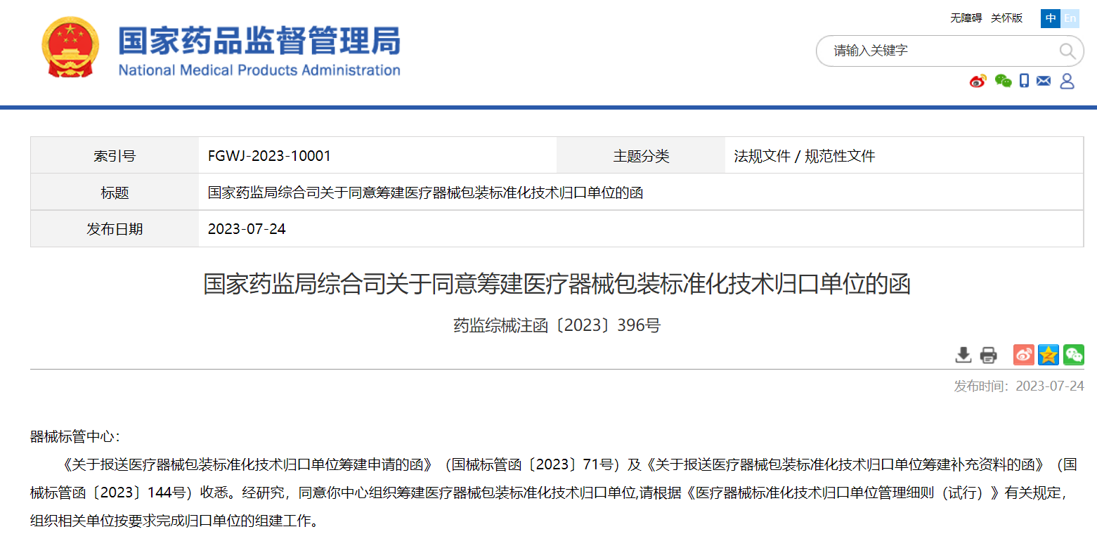 國(guó)家藥監(jiān)局綜合司關(guān)于同意籌建醫(yī)療器械包裝標(biāo)準(zhǔn)化技術(shù)歸口單位的函