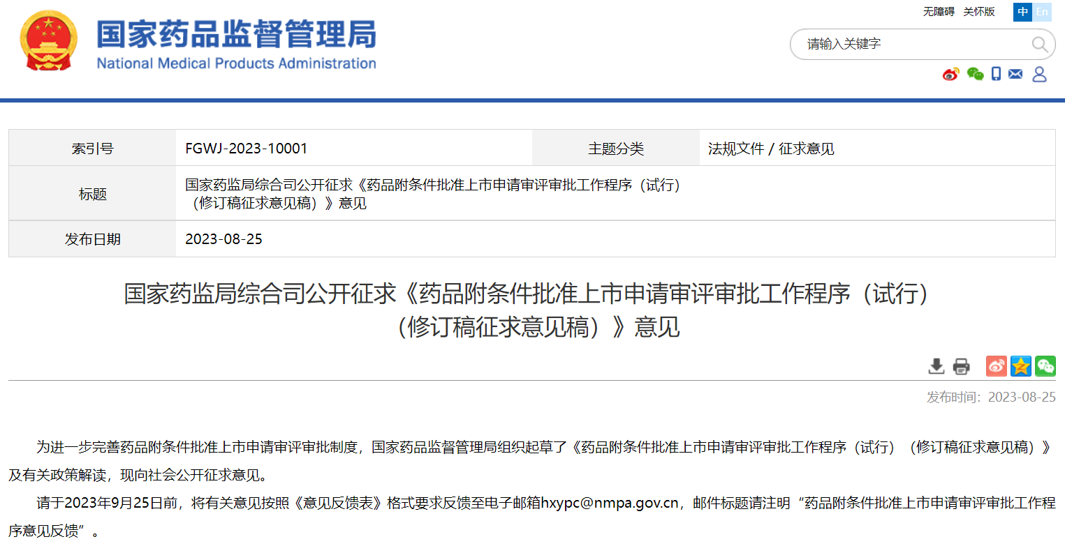 國家藥監(jiān)局綜合司公開征求《藥品附條件批準(zhǔn)上市申請審評審批工作程序(試行)(修訂稿征求意見稿)》意見