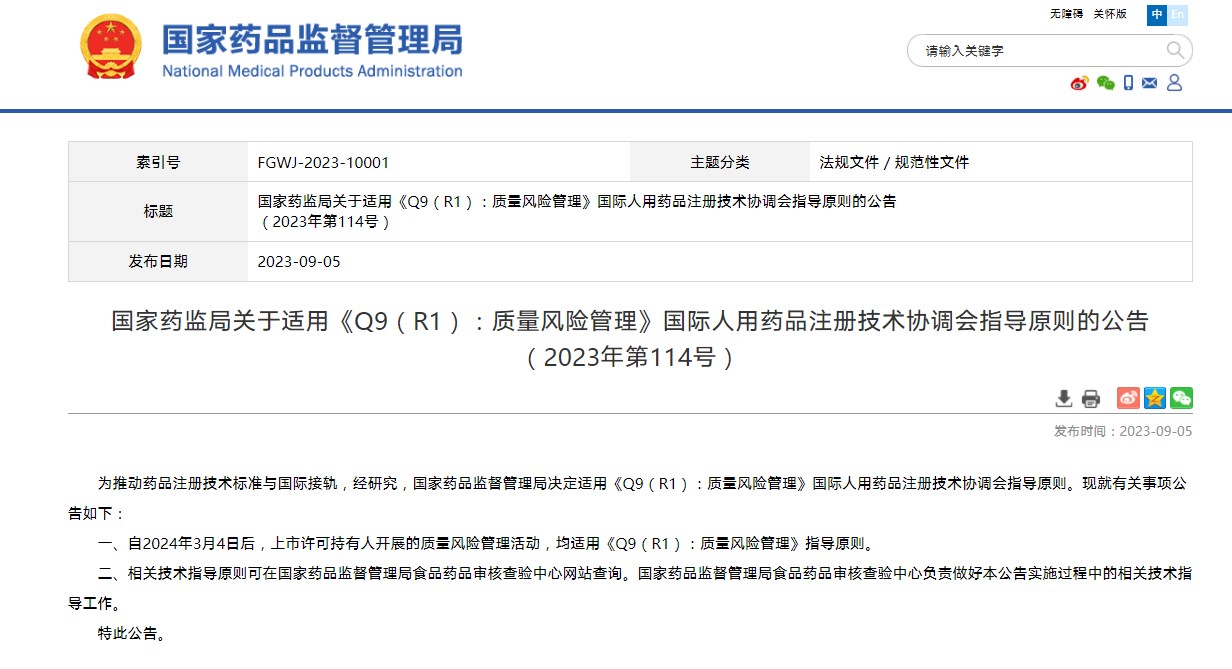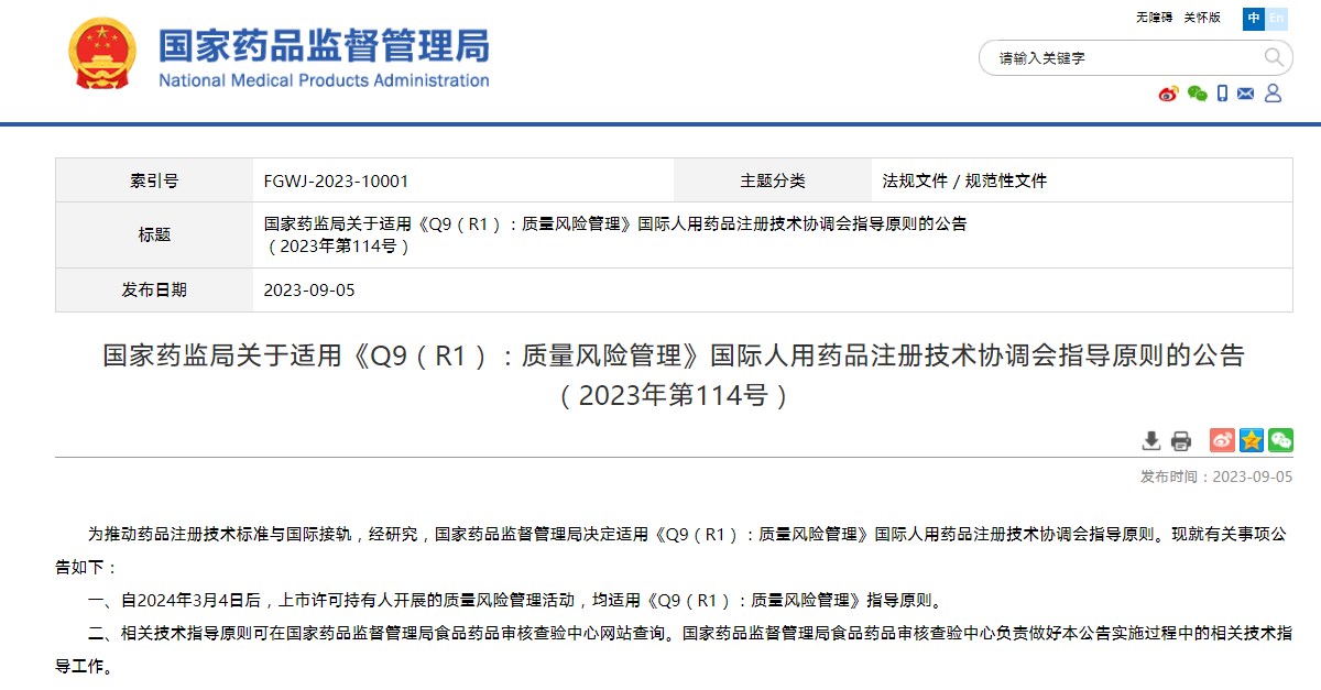 國家藥監(jiān)局關(guān)于適用《Q9(R1):質(zhì)量風(fēng)險管理》國際人用藥品注冊技術(shù)協(xié)調(diào)會指導(dǎo)原則的公告(2023年第114號)