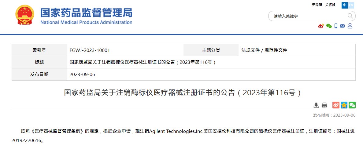 國家藥監(jiān)局關(guān)于注銷酶標(biāo)儀醫(yī)療器械注冊證書的公告(2023年第116號)