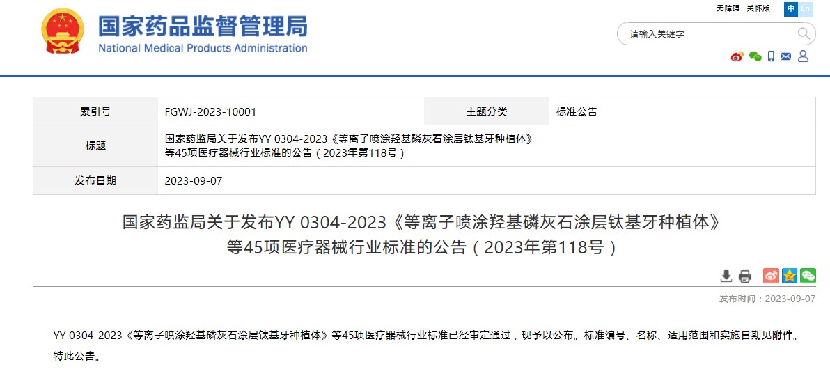 國家藥監(jiān)局關(guān)于發(fā)布YY 0304-2023《等離子噴涂羥基磷灰石涂層鈦基牙種植體》 等45項(xiàng)醫(yī)療器械行業(yè)標(biāo)準(zhǔn)的公告(2023年第118號)