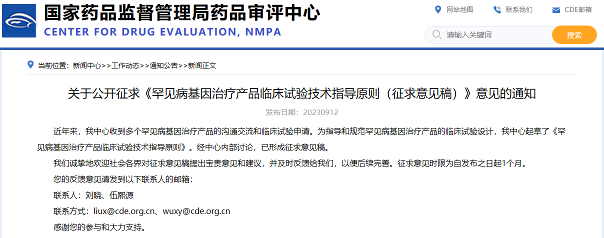 關(guān)于公開征求《罕見病基因治療產(chǎn)品臨床試驗(yàn)技術(shù)指導(dǎo)原則(征求意見稿)》意見的通知