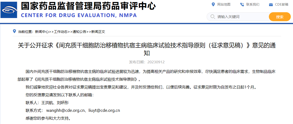 關(guān)于公開征求《間充質(zhì)干細(xì)胞防治移植物抗宿主病臨床試驗(yàn)技術(shù)指導(dǎo)原則(征求意見稿)》意見的通知