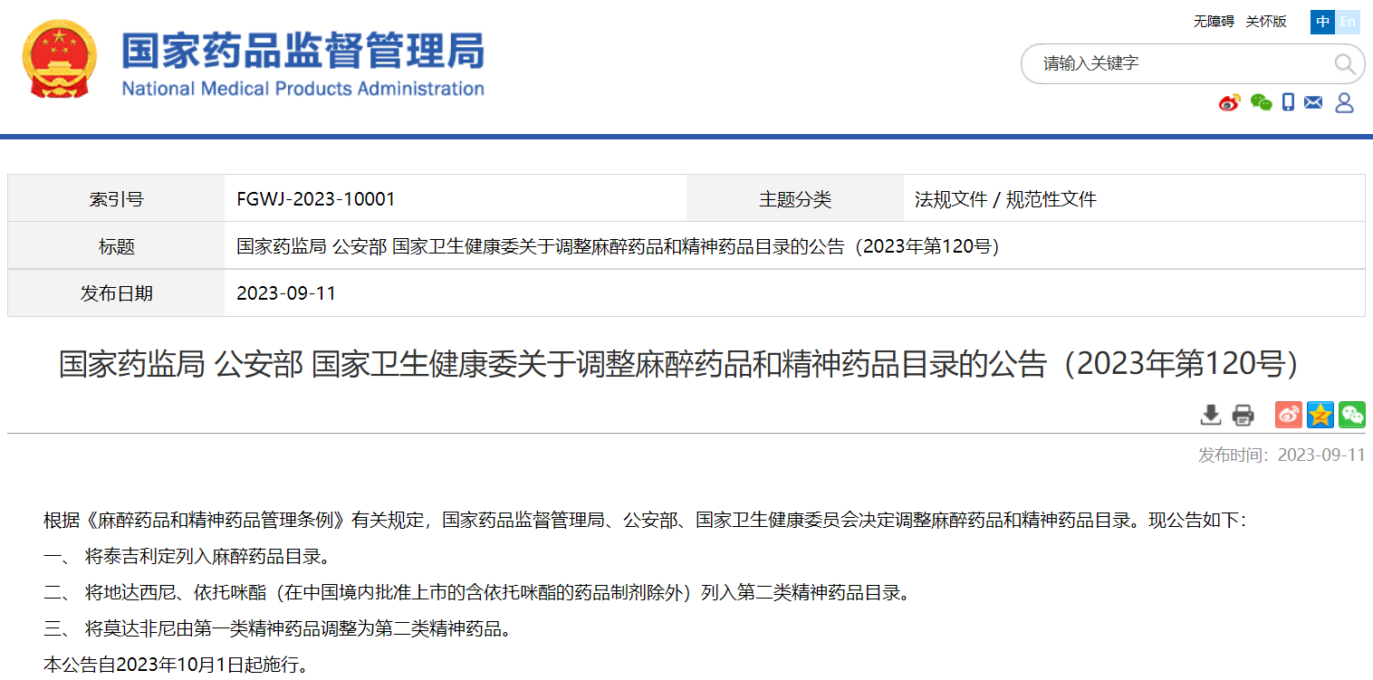 國家藥監(jiān)局 公安部 國家衛(wèi)生健康委關(guān)于調(diào)整麻醉藥品和精神藥品目錄的公告(2023年第120號)