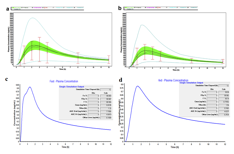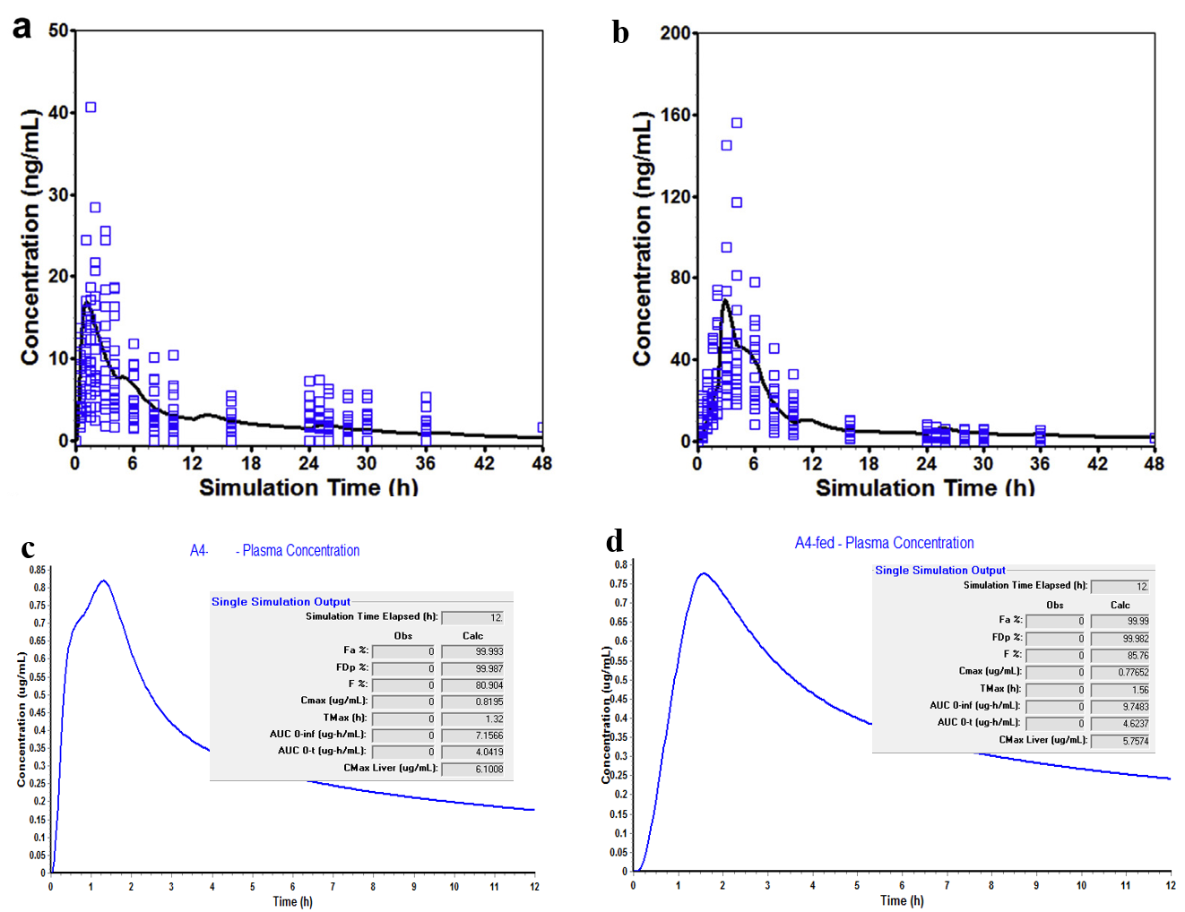 說明:a和b參考文獻(xiàn)中案例2軟件模擬和預(yù)測值,c和d是小編建模模擬值,分析由于數(shù)據(jù)信息欠缺與文獻(xiàn)值有差異,但是小編模擬結(jié)果也表明化合物2表現(xiàn)出明顯的正向食物效應(yīng)。