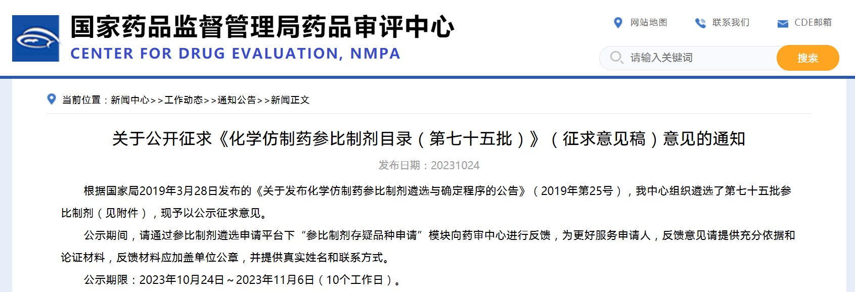 關(guān)于公開征求《化學(xué)仿制藥參比制劑目錄(第七十五批)》(征求意見稿)意見的通知