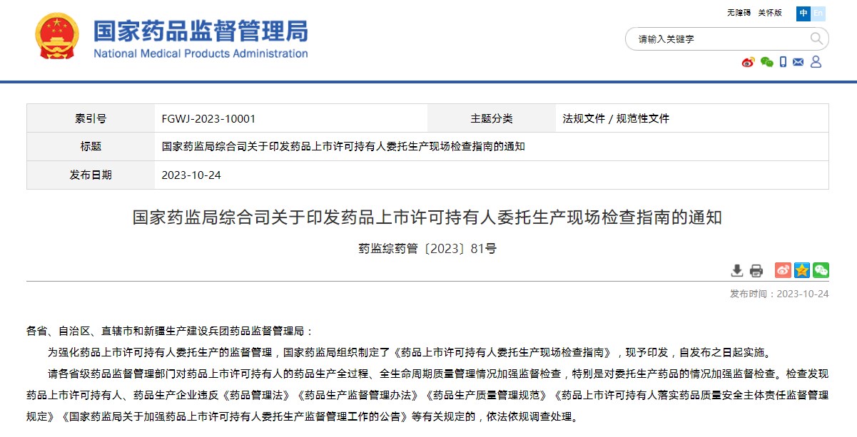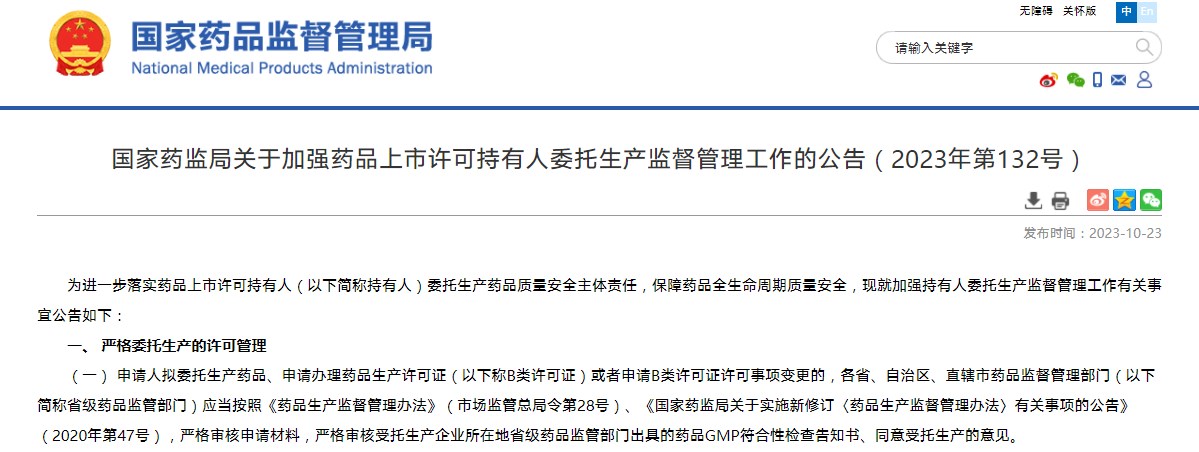 國(guó)家藥監(jiān)局關(guān)于加強(qiáng)藥品上市許可持有人委托生產(chǎn)監(jiān)督管理工作的公告(2023年第132號(hào))