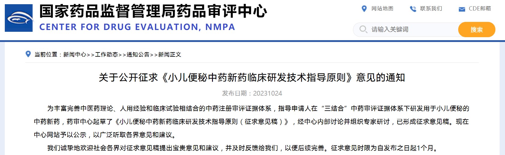 關(guān)于公開征求《小兒便秘中藥新藥臨床研發(fā)技術(shù)指導(dǎo)原則》意見的通知