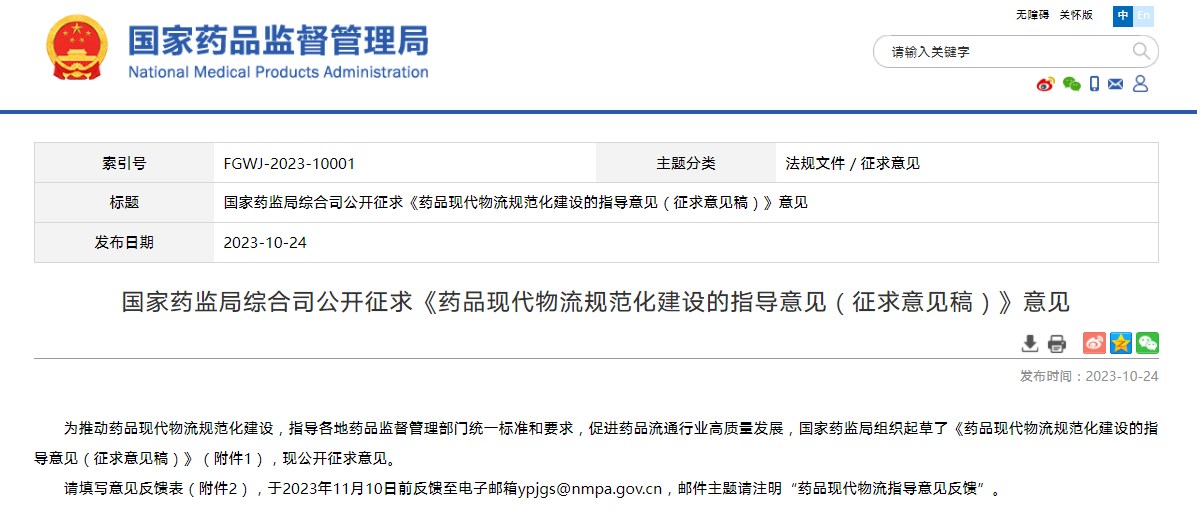 國(guó)家藥監(jiān)局綜合司公開征求《藥品現(xiàn)代物流規(guī)范化建設(shè)的指導(dǎo)意見(征求意見稿)》意見