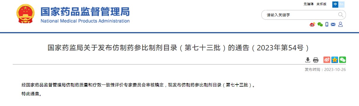 國(guó)家藥監(jiān)局關(guān)于發(fā)布仿制藥參比制劑目錄(第七十三批)的通告(2023年第54號(hào))