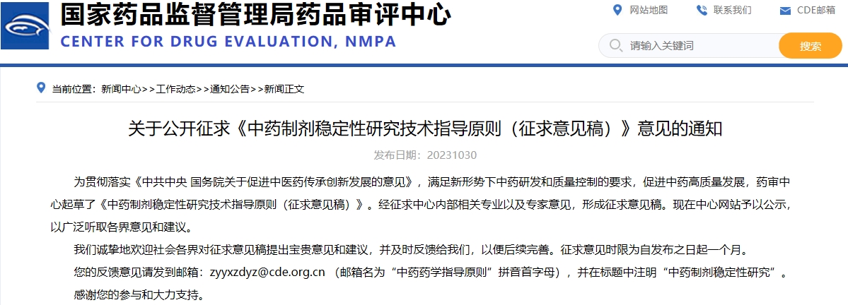 關(guān)于公開征求《中藥制劑穩(wěn)定性研究技術(shù)指導(dǎo)原則(征求意見稿)》意見的通知