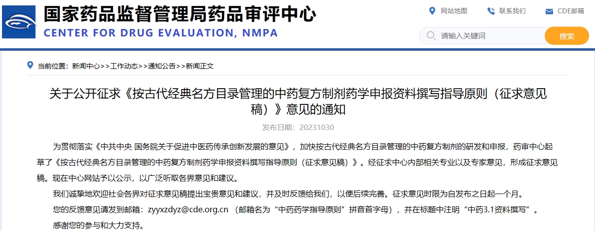 關(guān)于公開征求《按古代經(jīng)典名方目錄管理的中藥復(fù)方制劑藥學申報資料撰寫指導(dǎo)原則(征求意見稿)》意見的通知