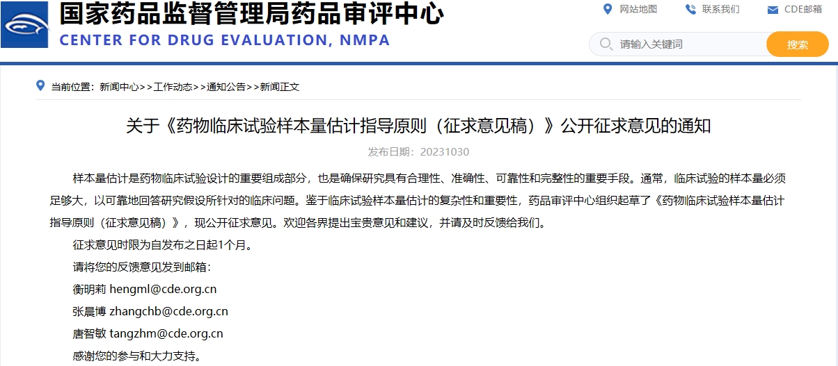 關(guān)于《藥物臨床試驗樣本量估計指導(dǎo)原則(征求意見稿)》公開征求意見的通知