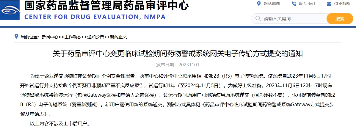 關(guān)于藥品審評中心變更臨床試驗期間藥物警戒系統(tǒng)網(wǎng)關(guān)電子傳輸方式提交的通知