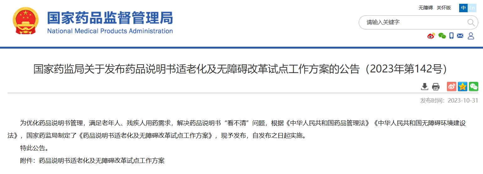 國家藥監(jiān)局關(guān)于發(fā)布藥品說明書適老化及無障礙改革試點工作方案的公告(2023年第142號)