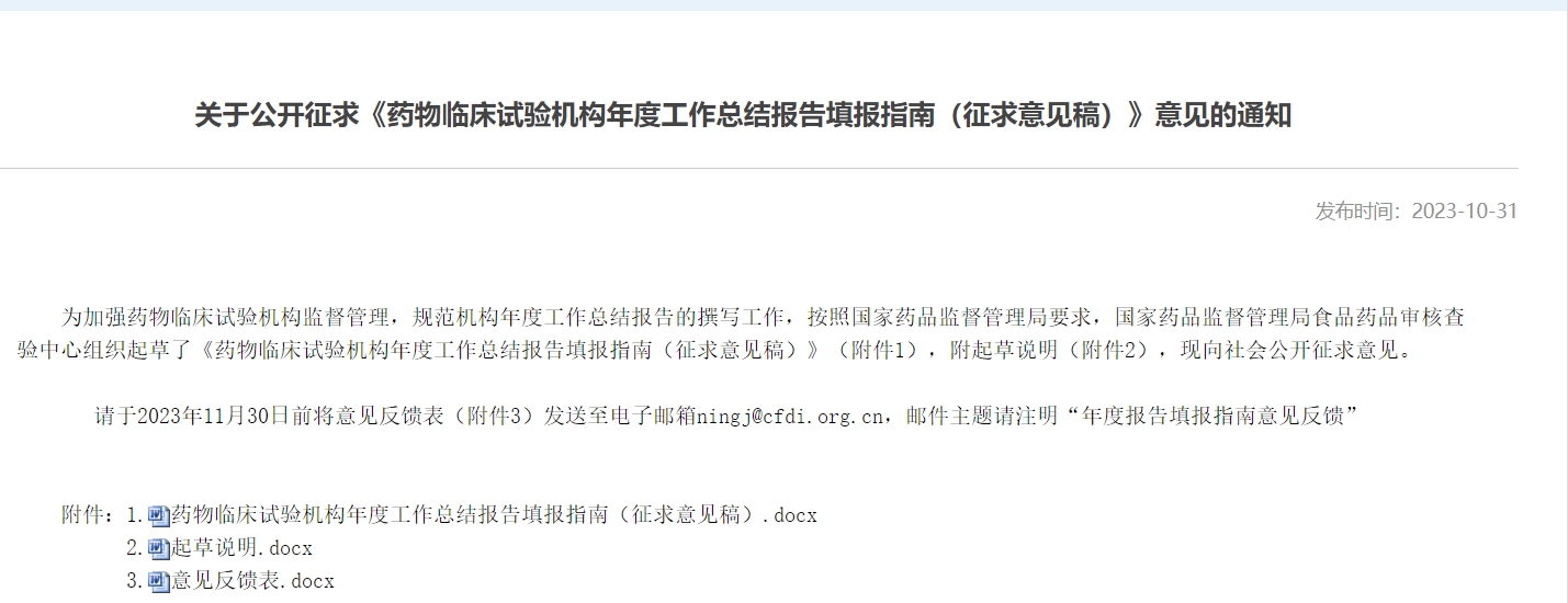 關(guān)于公開征求《藥物臨床試驗機構(gòu)年度工作總結(jié)報告填報指南(征求意見稿)》意見的通知