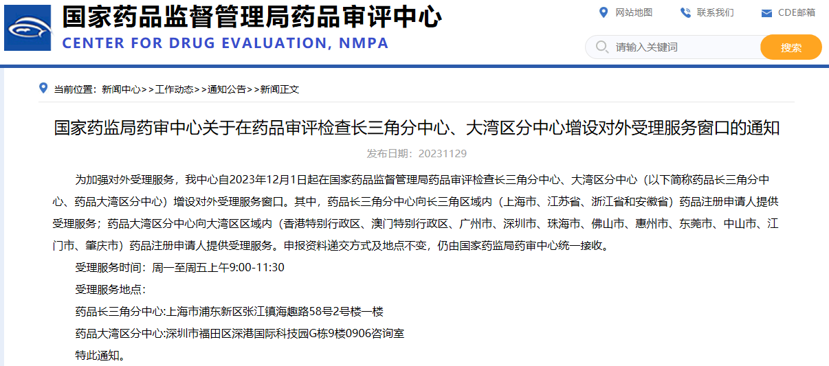 國家藥監(jiān)局藥審中心關(guān)于在藥品審評(píng)檢查長(zhǎng)三角分中心、大灣區(qū)分中心增設(shè)對(duì)外受理服務(wù)窗口的通知