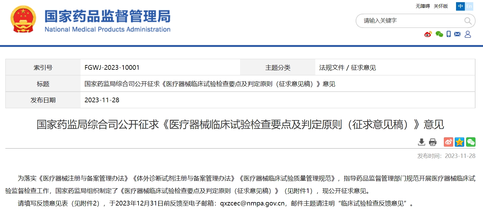 國家藥監(jiān)局綜合司公開征求《醫(yī)療器械臨床試驗(yàn)檢查要點(diǎn)及判定原則(征求意見稿)》意見