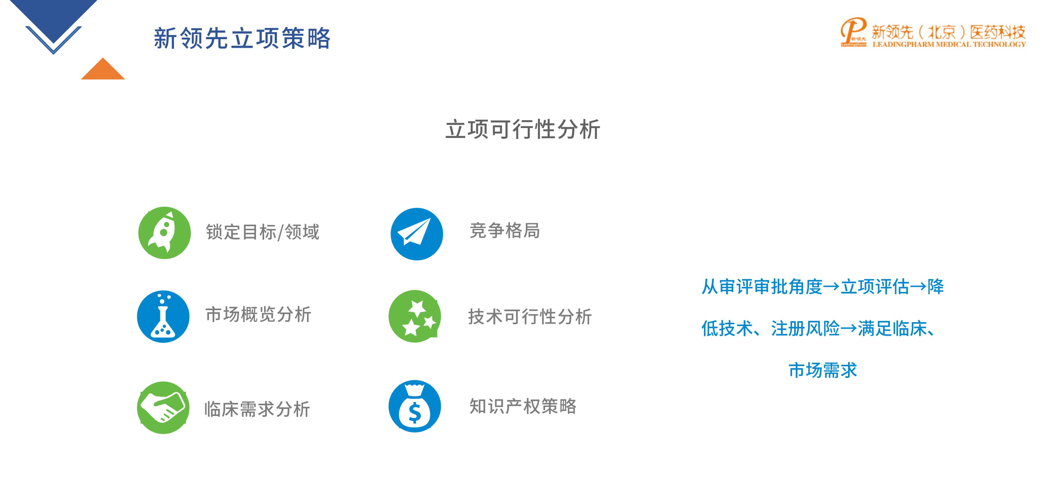 新領先始終堅持“以終為始,以滿足未被滿足的臨床需求作為出發(fā)點”的立項策略。結合企業(yè)自身情況,鎖定目標領域,自上而下進行全行業(yè)分析,發(fā)掘具有臨床優(yōu)勢和市場優(yōu)勢的重點產品;對于改良新型項目,根據(jù)現(xiàn)有的治療方案,挖掘未滿足的臨床需求,尋找合適的技術手段,填補市場空白并滿足臨床需求;此外,還要重點考慮競爭激烈程度和技術可行性,并制定對應的知識產權策略,如規(guī)避、無效、擇期開發(fā)等,保證整體項目具備臨床、市場、進度優(yōu)勢,徹底解決企業(yè)的后顧之憂。