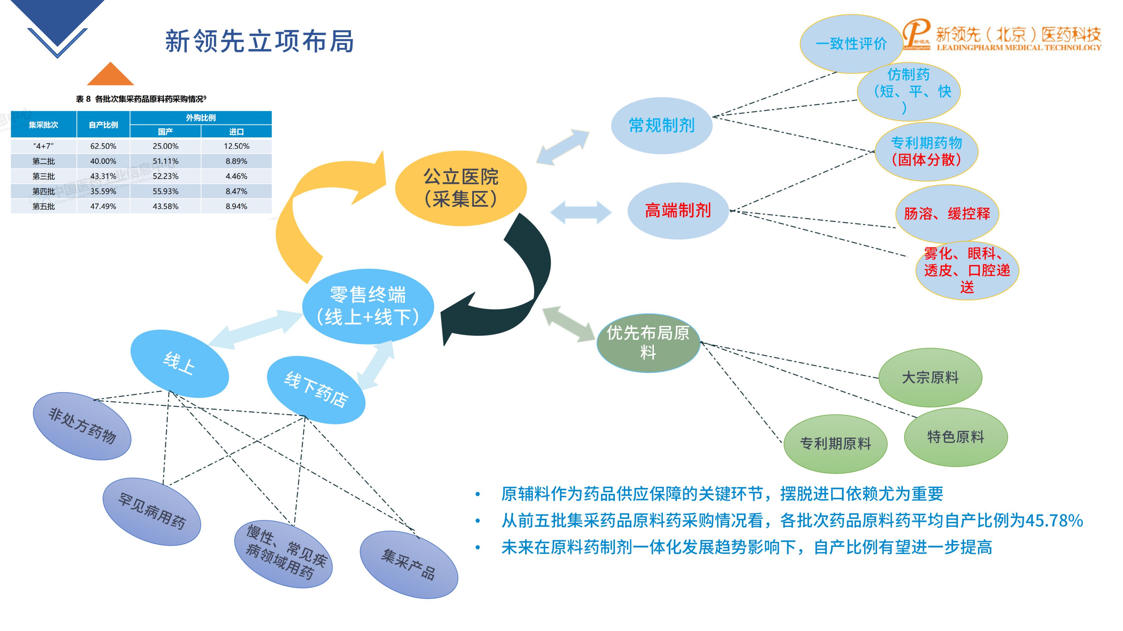 對于不同的銷售渠道,我們結合渠道特性,布局相適應的產品。例如對于以公立醫(yī)院渠道為主的企業(yè),可以開展常規(guī)制劑的一致性評價、短平快仿制藥作為短期布局,專利期產品(如固體分散體)、腸溶/緩控釋/霧化/透皮/眼科/口腔遞送等高端制劑的改良創(chuàng)新可作為中長期布局,并進行產品管線的生命周期管理;為了應對集采,可優(yōu)先布局原料,未來在原料藥制劑一體化發(fā)展趨勢影響下,自產比例有望進一步提高。此外,對于具有零售渠道優(yōu)勢的企業(yè),可進行非處方藥物、罕見病藥物、慢病藥物、集采產品的線上和線下藥店布局,躲避集采的同時,也具有更高的利潤空間。
