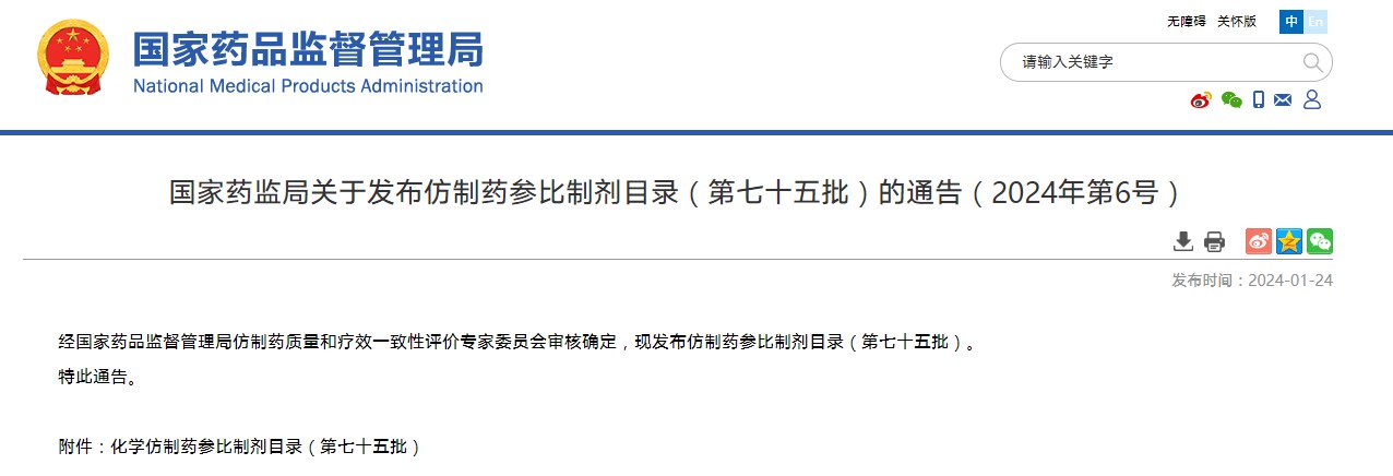國(guó)家藥監(jiān)局關(guān)于發(fā)布仿制藥參比制劑目錄(第七十五批)的通告(2024年第6號(hào))