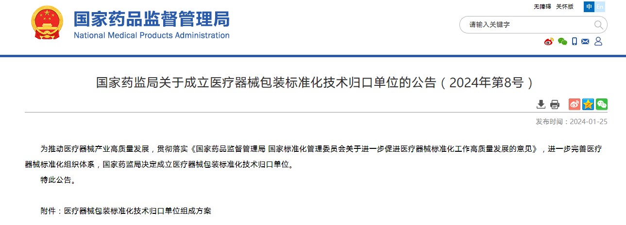 國(guó)家藥監(jiān)局關(guān)于成立醫(yī)療器械包裝標(biāo)準(zhǔn)化技術(shù)歸口單位的公告(2024年第8號(hào))
