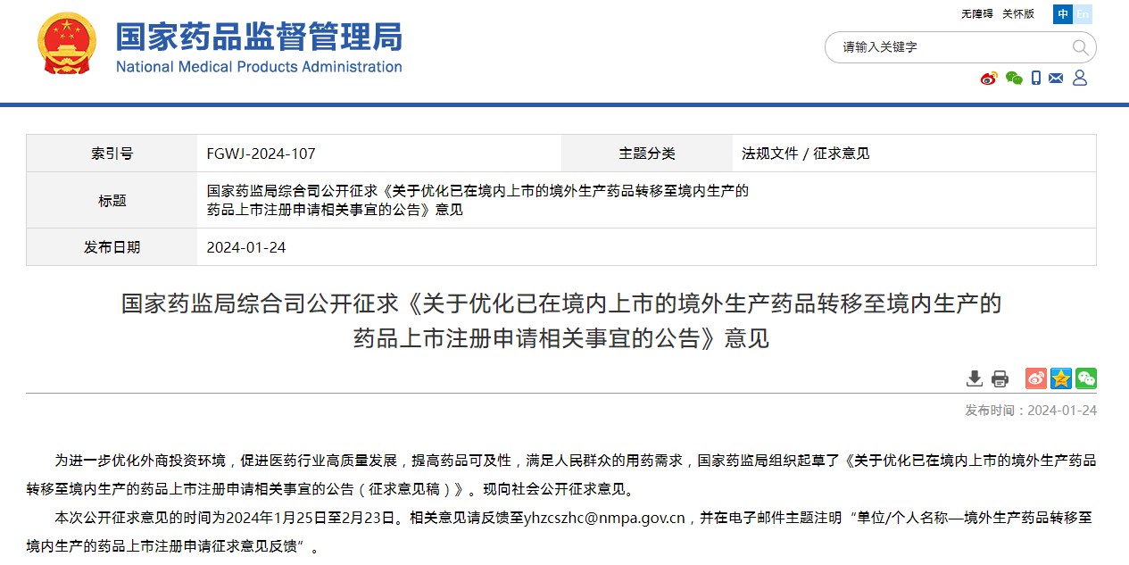 國(guó)家藥監(jiān)局綜合司公開(kāi)征求《關(guān)于優(yōu)化已在境內(nèi)上市的境外生產(chǎn)藥品轉(zhuǎn)移至境內(nèi)生產(chǎn)的藥品上市注冊(cè)申請(qǐng)相關(guān)事宜的公告》意見(jiàn)