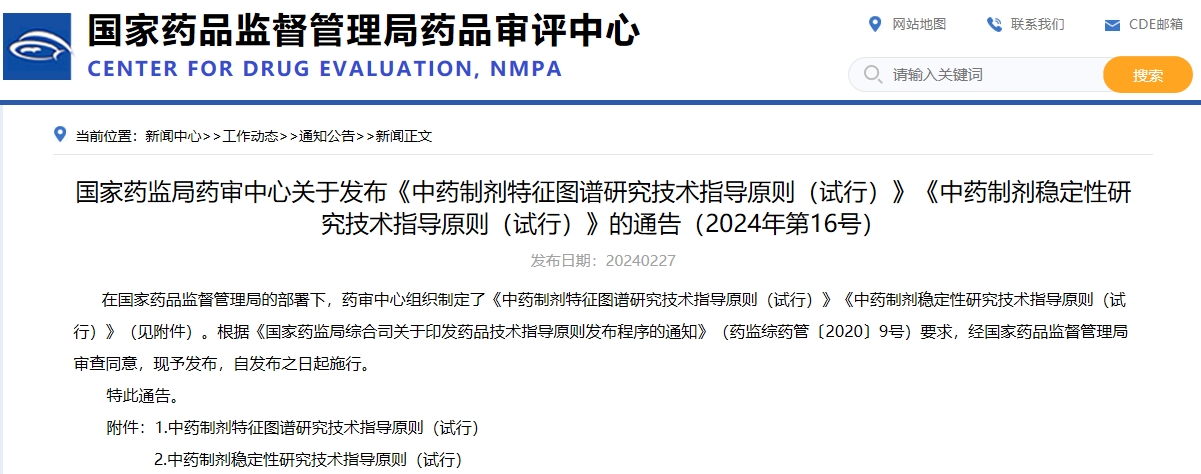 國家藥監(jiān)局藥審中心關于發(fā)布《中藥制劑特征圖譜研究技術(shù)指導原則(試行)》《中藥制劑穩(wěn)定性研究技術(shù)指導原則(試行)》的通告(2024年第16號)