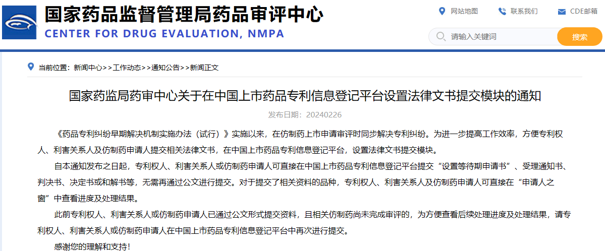 國家藥監(jiān)局藥審中心關于在中國上市藥品專利信息登記平臺設置法律文書提交模塊的通知