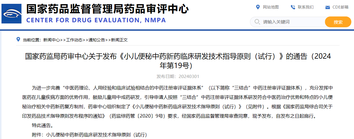 國家藥監(jiān)局藥審中心關于發(fā)布《小兒便秘中藥新藥臨床研發(fā)技術(shù)指導原則(試行)》的通告(2024年第19號)