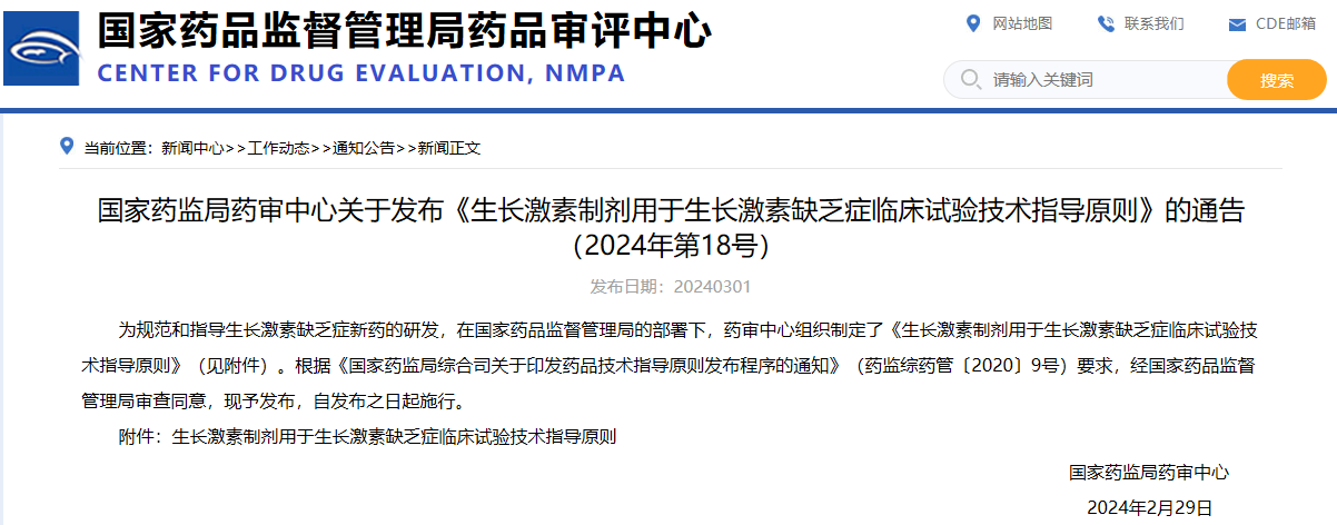 國家藥監(jiān)局藥審中心關于發(fā)布《生長激素制劑用于生長激素缺乏癥臨床試驗技術(shù)指導原則》的通告(2024年第18號)
