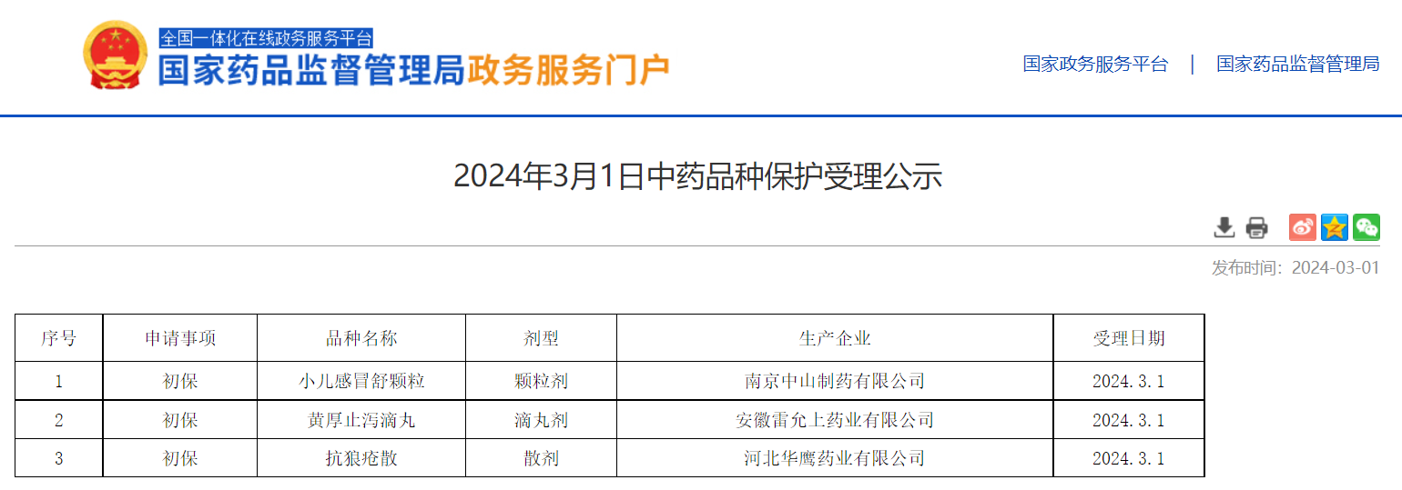 2024年3月1日中藥品種保護受理公示
