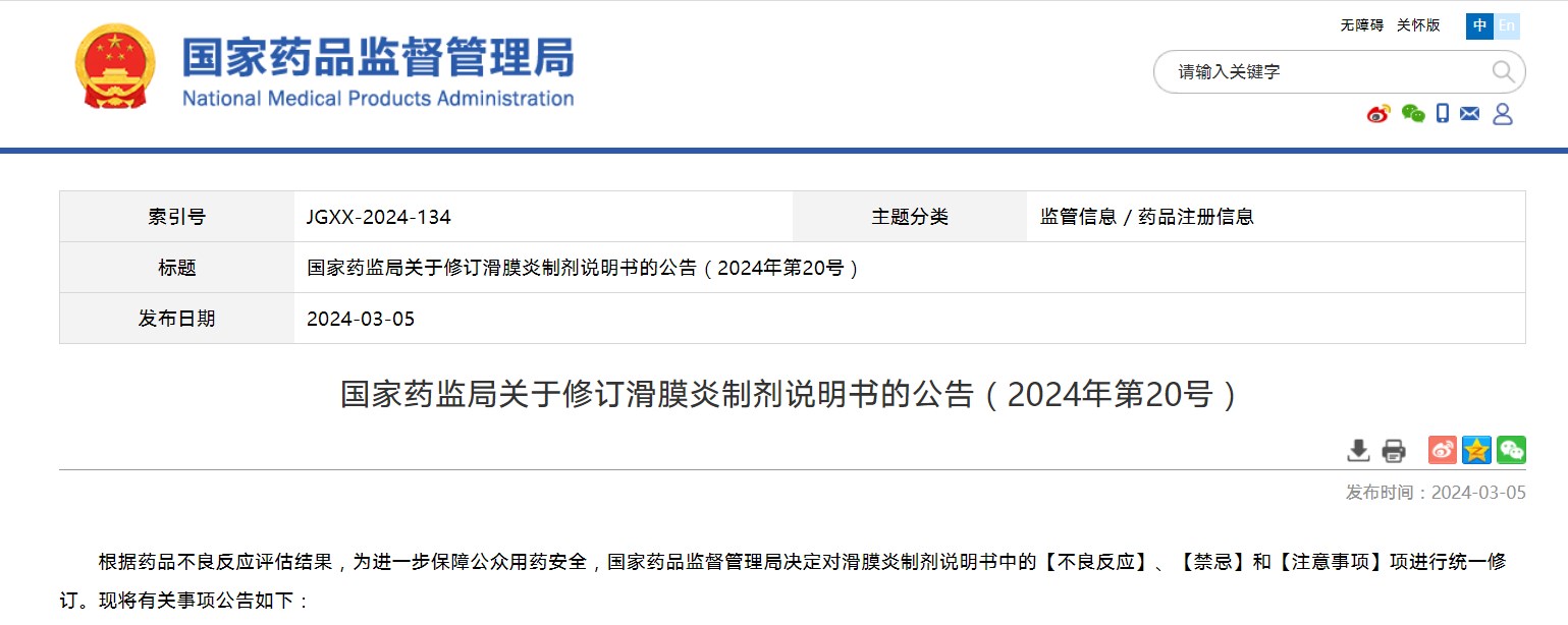 國家藥監(jiān)局關(guān)于修訂滑膜炎制劑說明書的公告(2024年第20號)