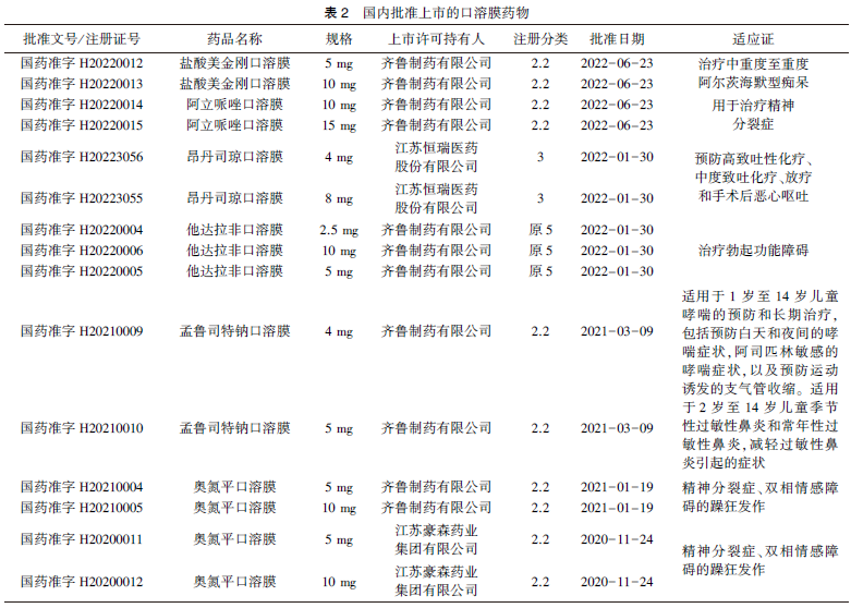 通過國家藥品監(jiān)督管理局網(wǎng)站查詢,統(tǒng)計(jì)了我國批準(zhǔn)的口溶膜藥物(見表2),共15個(gè)批準(zhǔn)文號(hào),按照注冊(cè)分類統(tǒng)計(jì),其中10個(gè)為2.2類改良型新藥,占大多數(shù);按適應(yīng)證統(tǒng)計(jì),其中6個(gè)為精神障礙疾病藥物、3個(gè)為生殖系統(tǒng)疾病藥物、2個(gè)為精神神經(jīng)系統(tǒng)藥物、2個(gè)為呼吸系統(tǒng)疾病及抗過敏藥物、2個(gè)消化道及代謝藥物。