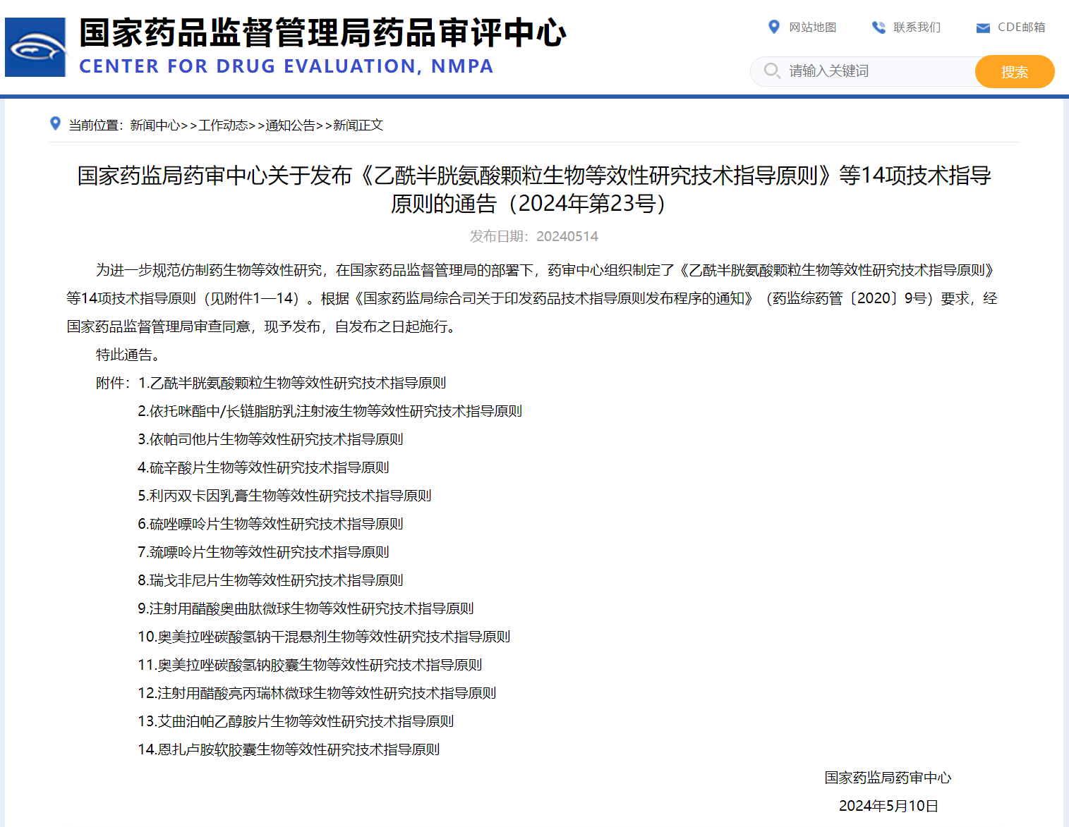 國家藥監(jiān)局藥審中心關于發(fā)布《乙酰半胱氨酸顆粒生物等效性研究技術指導原則》等14項技術指導原則的通告(2024年第23號)