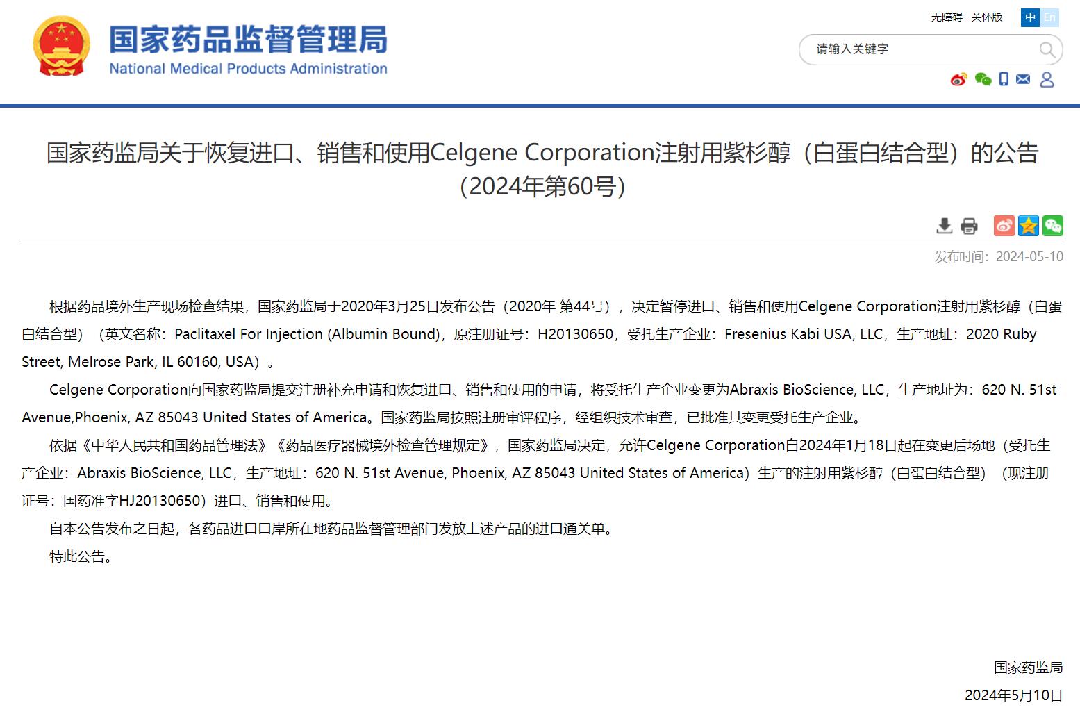 國家藥監(jiān)局關于恢復進口、銷售和使用Celgene Corporation注射用紫杉醇(白蛋白結合型)的公告(2024年第60號)