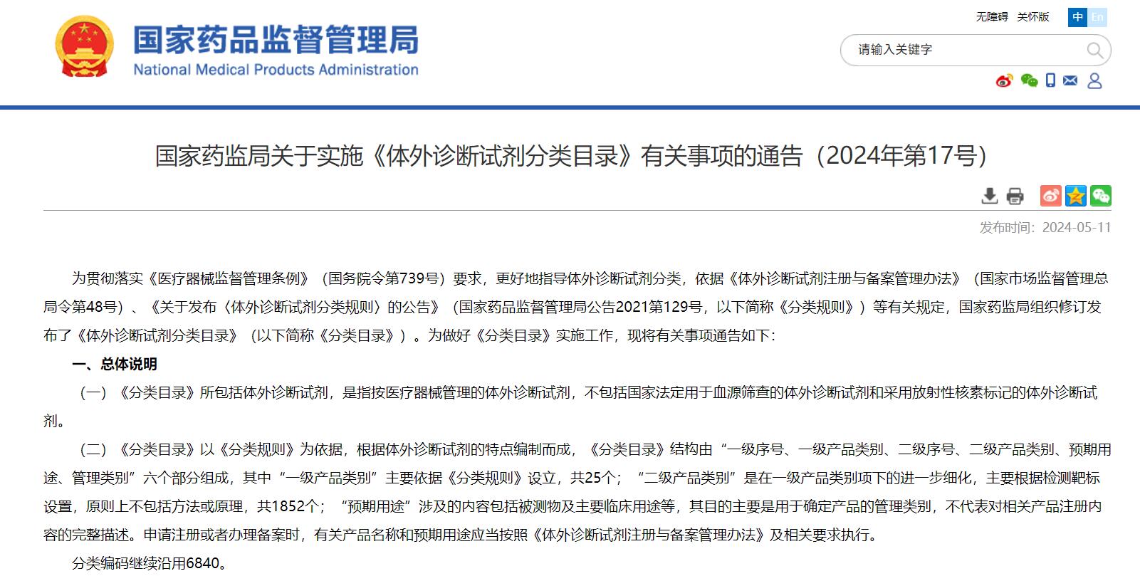 國家藥監(jiān)局關于實施《體外診斷試劑分類目錄》有關事項的通告(2024年第17號)
