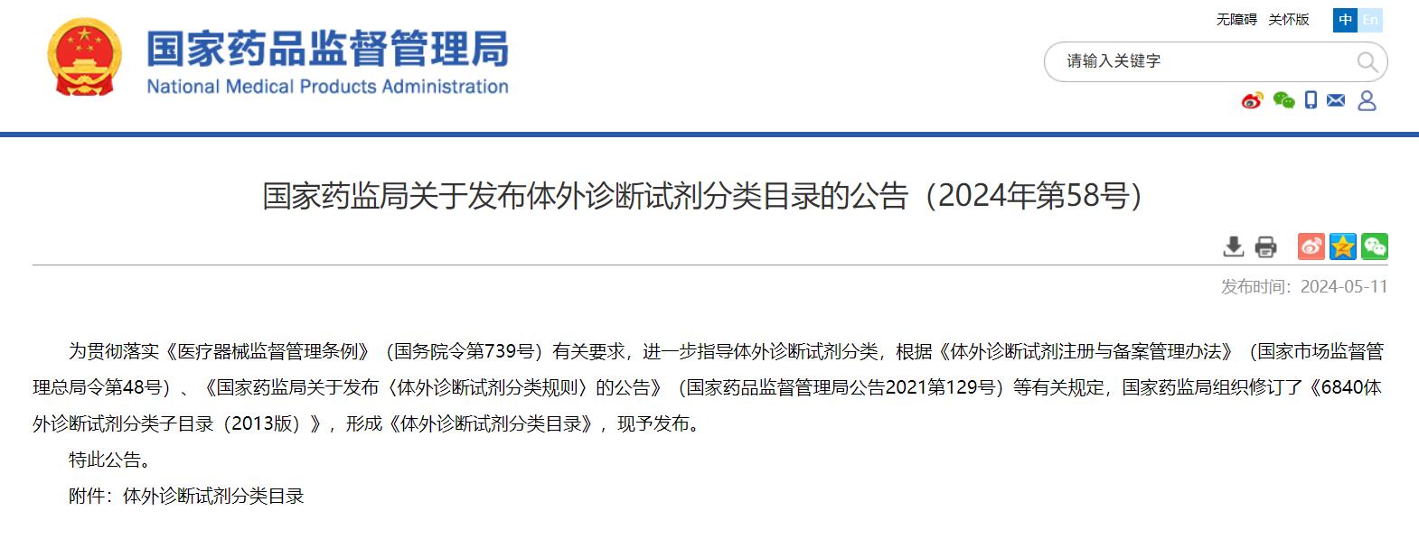 國家藥監(jiān)局關于發(fā)布體外診斷試劑分類目錄的公告(2024年第58號)