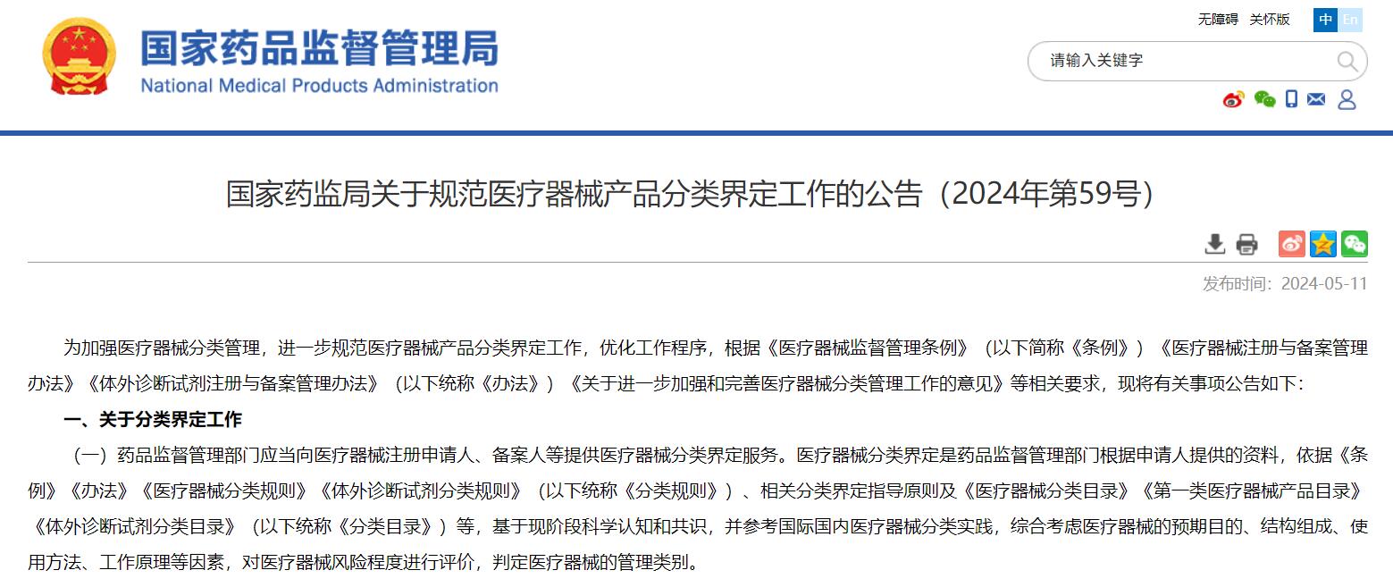 國家藥監(jiān)局關于規(guī)范醫(yī)療器械產品分類界定工作的公告(2024年第59號)