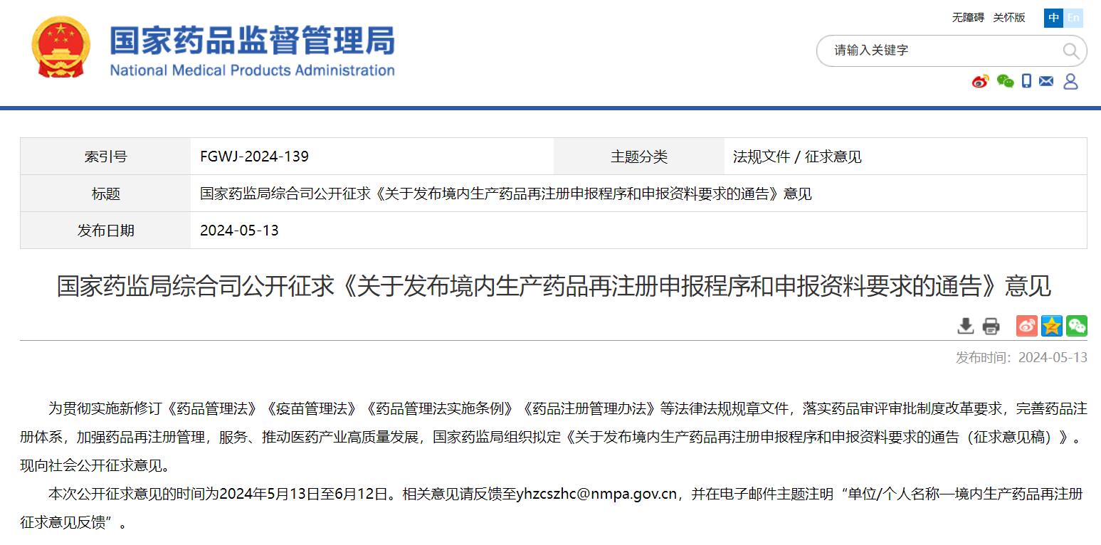 國家藥監(jiān)局綜合司公開征求《關于發(fā)布境內生產藥品再注冊申報程序和申報資料要求的通告》意見