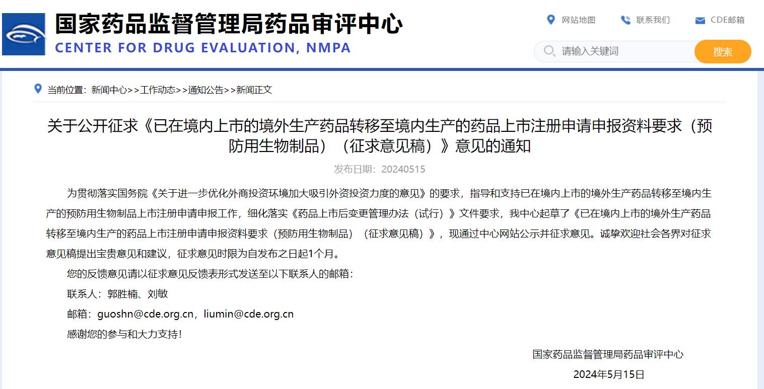 關于公開征求《已在境內上市的境外生產藥品轉移至境內生產的藥品上市注冊申請申報資料要求(預防用生物制品)(征求意見稿)》意見的通知
