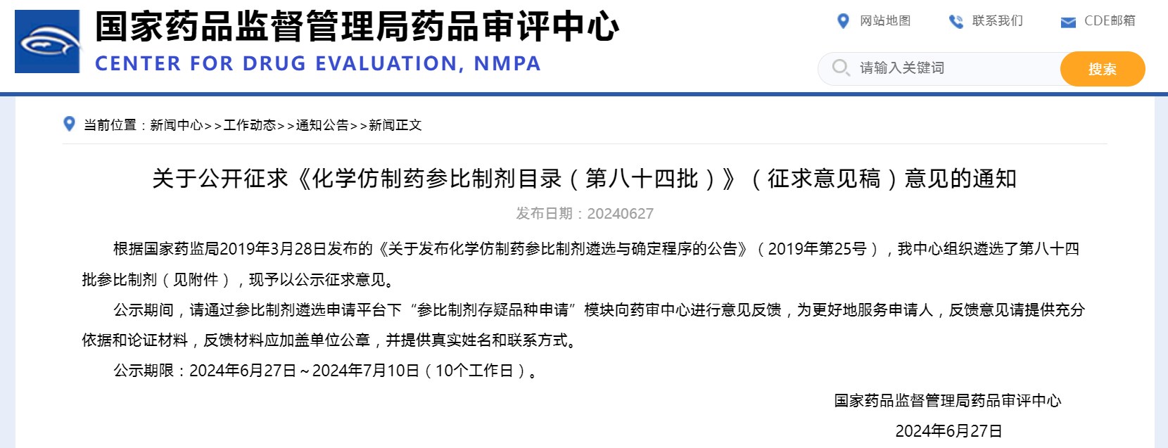 關(guān)于公開(kāi)征求《化學(xué)仿制藥參比制劑目錄(第八十四批)》(征求意見(jiàn)稿)意見(jiàn)的通知