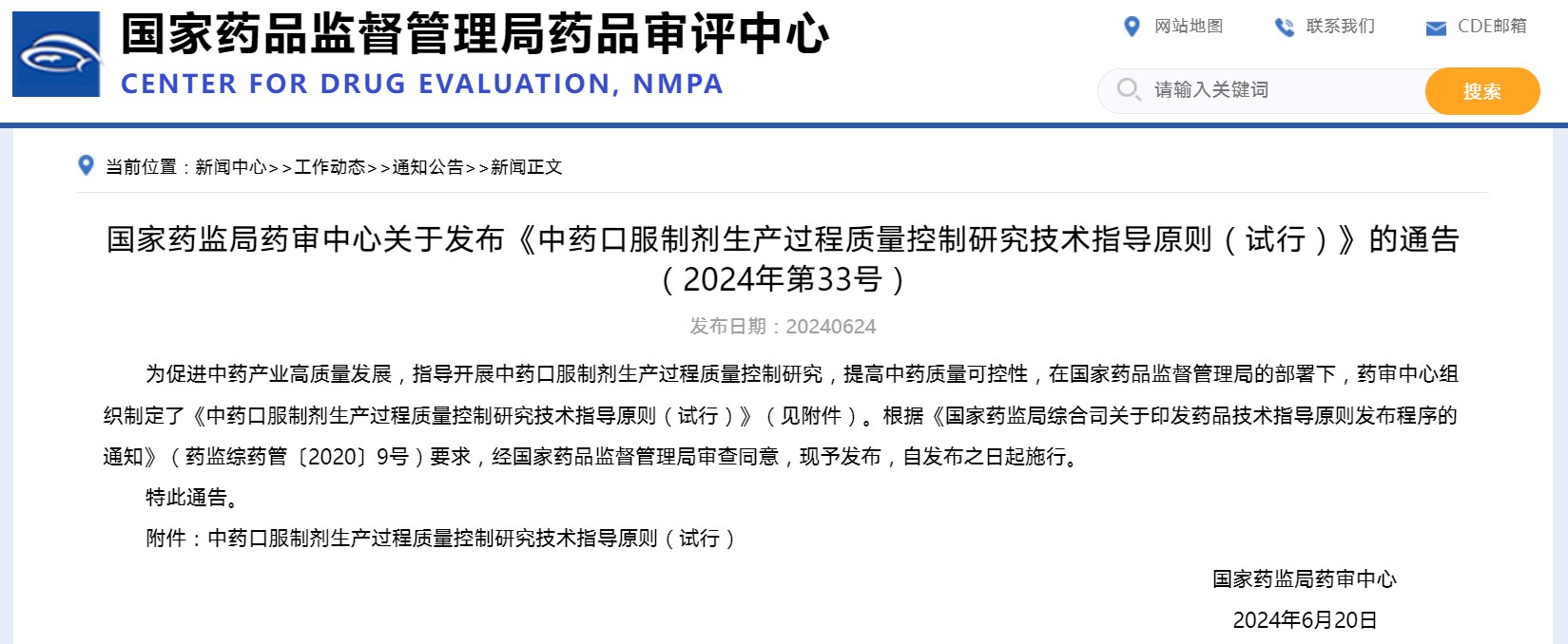 關(guān)于發(fā)布《中藥口服制劑生產(chǎn)過(guò)程質(zhì)量控制研究技術(shù)指導(dǎo)原則(試行)》的通告
