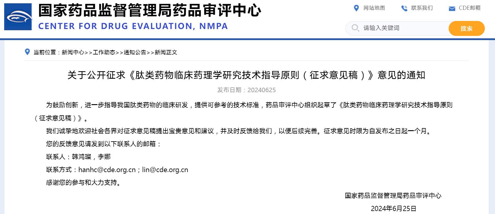關(guān)于公開(kāi)征求《肽類(lèi)藥物臨床藥理學(xué)研究技術(shù)指導(dǎo)原則(征求意見(jiàn)稿)》意見(jiàn)的通知
