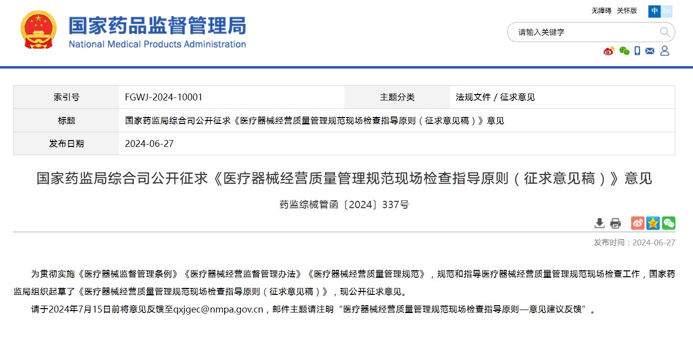 公開(kāi)征求《醫(yī)療器械經(jīng)營(yíng)質(zhì)量管理規(guī)范現(xiàn)場(chǎng)檢查指導(dǎo)原則(征求意見(jiàn)稿)》意見(jiàn)