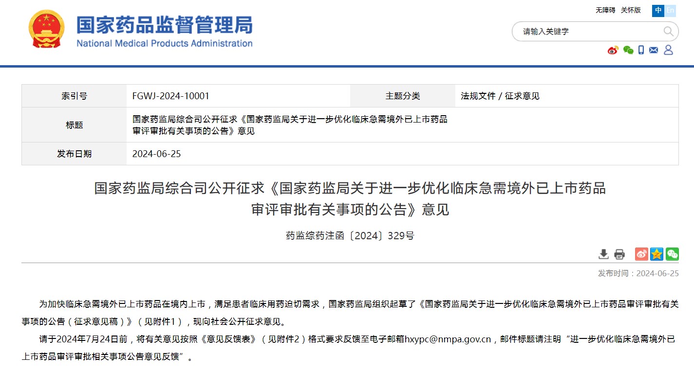 公開(kāi)征求《國(guó)家藥監(jiān)局關(guān)于進(jìn)一步優(yōu)化臨床急需境外已上市藥品審評(píng)審批有關(guān)事項(xiàng)的公告》意見(jiàn)