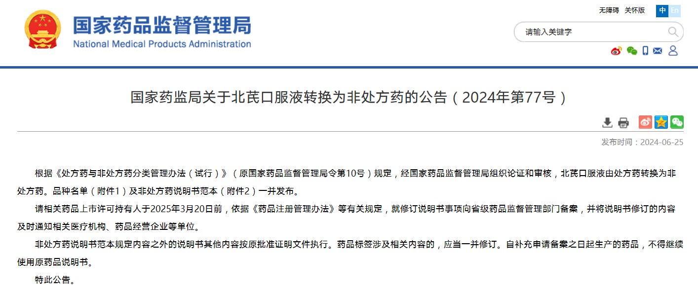 關(guān)于北芪口服液轉(zhuǎn)換為非處方藥的公告