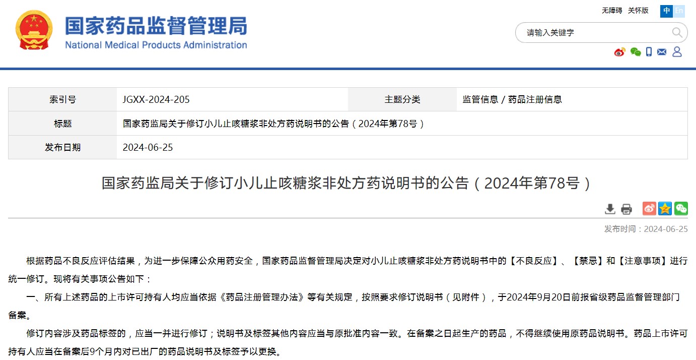 關(guān)于修訂小兒止咳糖漿非處方藥說(shuō)明書(shū)的公告